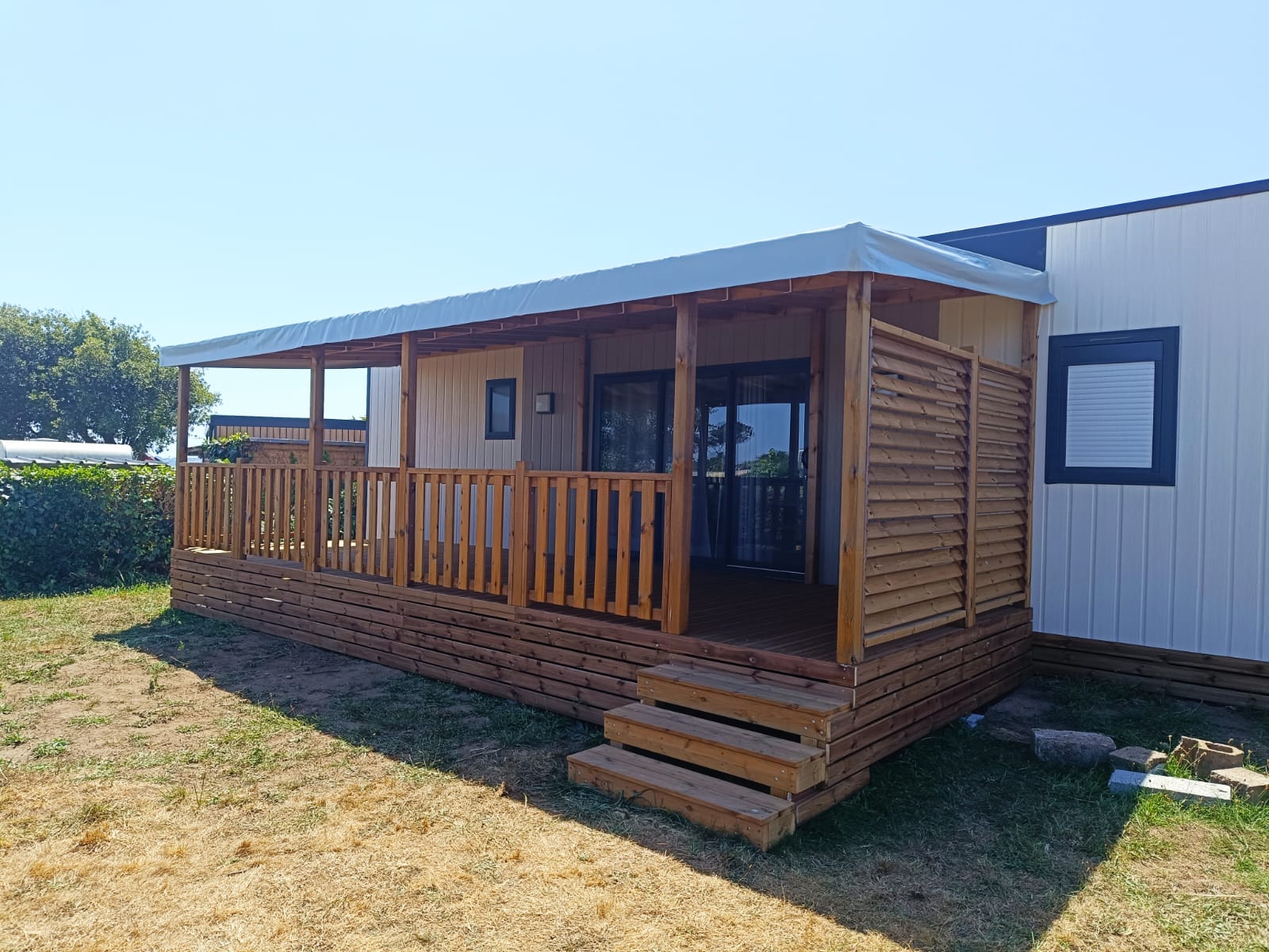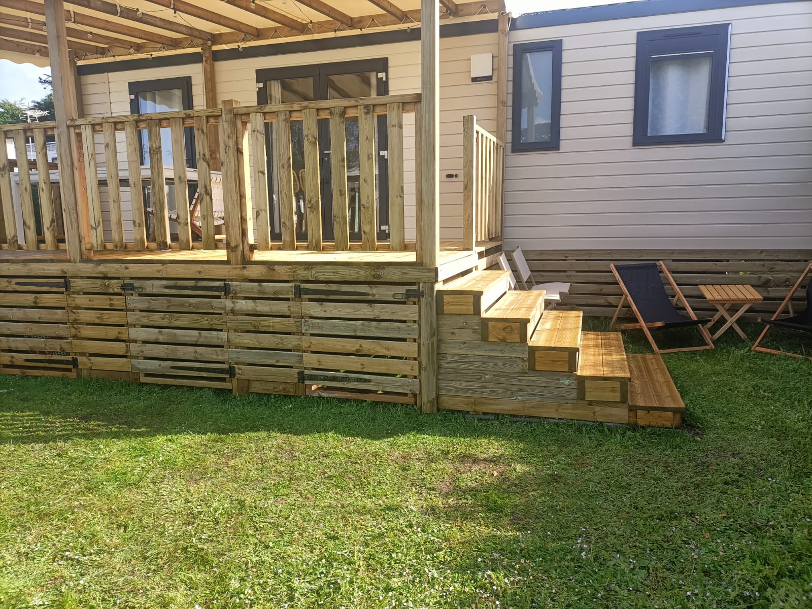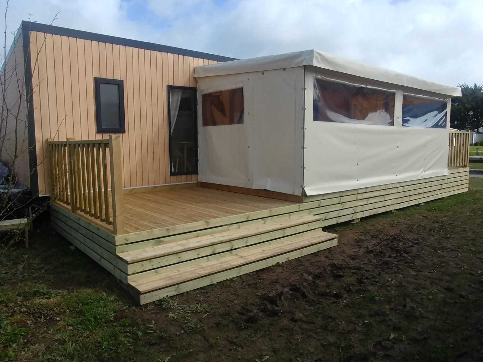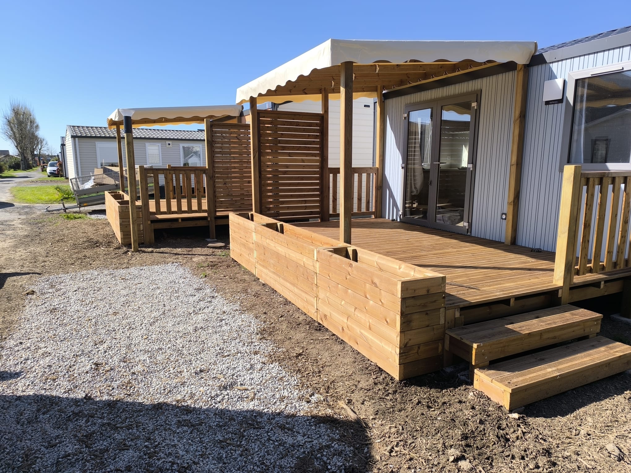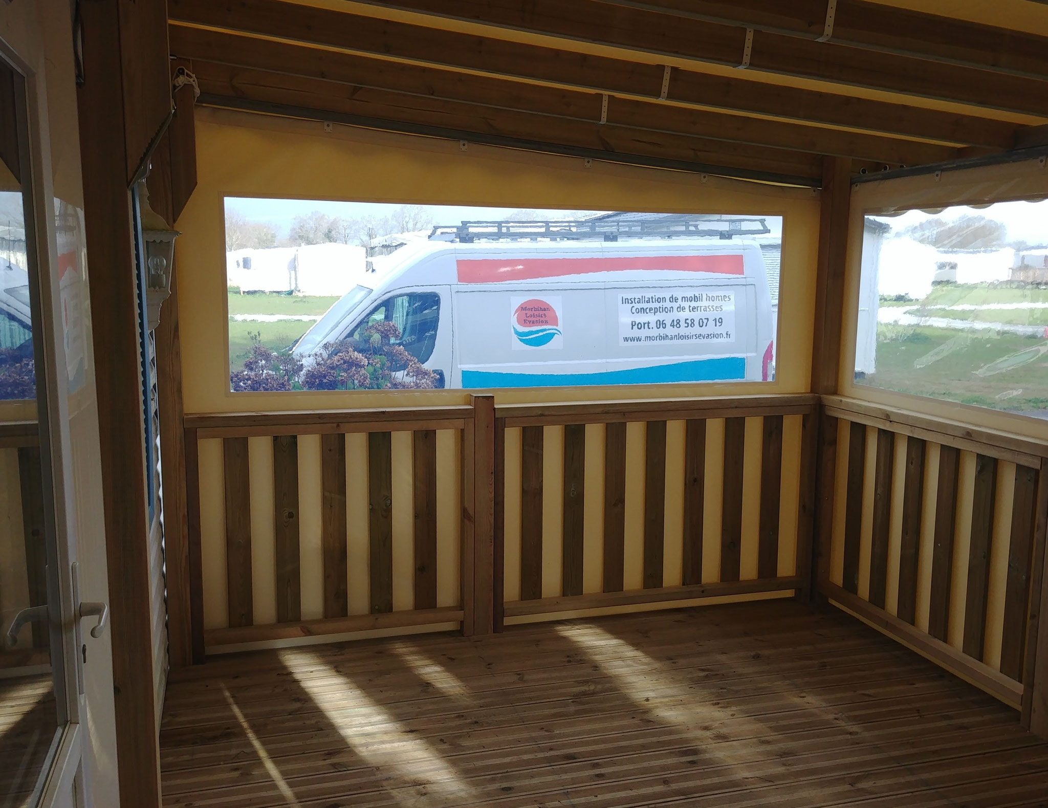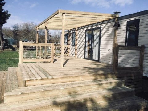 Toutes les terrasses Morbihan Loisirs Evasion sont fabriquées en France dans notre atelier à Arzal dans le Morbihan. Elles s’adaptent à tous types et toutes marques de mobil homes et sont réalisées sur-mesure pour s'intégrer parfaitement à votre environnement.
